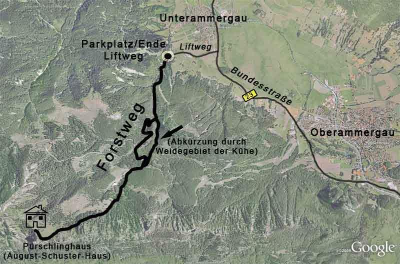 Auf der Mitte der Wanderung kommen wir aus dem Wald heraus auf eine größere Fläche. Dort befindet sich ein kleines Gasthaus, das meist offen hat und kleine Speisen anbietet. Das Gasthaus liegt am Beginn eines Hochtals. Links davon geht der Fortweg zum Pürschlingshaus. Rechts davon zieht sich ein bewaldeter Bergrücken hinauf, der oben direkt auf das Pürschlinghaus trifft. Dort gibt es einen wunderschönen Wanderweg, der allerdings sehr naturbelassen ist und vielfach über ausgedehnte Wurzelwerke führt.