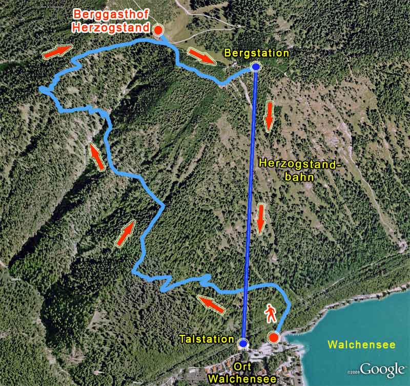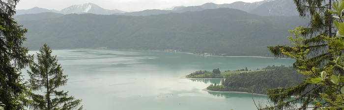 Der Herzogstand welcher hoch über dem Walchensee liegt, ist ein beliebtes Wandergebiet. Der bekannteste Aufstieg zum Herzogstand beginnt bei der Talstation der Herzogstandseilbahn. Von hier aus schlängelt sich der Weg durch bayerischen Gebirgswald über die Südseite des Berges nach oben. Der Aufstieg bietet ein märchenhaftes Panorama, auf den türkisfarbenen Walchensee und die Gebirgsketten der Alpen. Dieser Weg ist eine hervorragende und sportliche Alternative zur Herzogstandseilbahn. Gegen Ende hin wird der Weg zunehmend steiler. Ein gutes Schuhwerk, vor allem bei oder nach einem Regenguss ist unabdingbar. Der steinige und schmale Weg ist teilweise von kleinen und großen Wurzeln überlagert. Sind diese nass, kann man gerade bei den steileren Passagen leicht ausrutschen. Nach circa zwei Stunden kommt man an der ehemaligen Berghütte von König Ludwig II vorbei. Direkt dahinter liegt der Berggasthof Herzogstand (1575m). Wer hier noch nicht einkehren möchte, der wandert weiter zum Gipfelpavillon des Herzogstands (1731m). Diesen ließ König Ludwig II errichten. Hier schrieb er oft lange Briefe an seine Erzieherin aus Kindheitstagen, während er das umfassende Panorama genoss. Nach einer Mahlzeit im Gasthof Herzogstand kann man entweder wieder zu Fuß absteigen oder die Herzogstandseilbahn nehmen. Vom Gasthof führt ein breiter Kiesweg in zehn Minuten zur Bergstation der Seilbahn. Da die Seilbahn, in rasanter Schnelle, die Wanderer nicht nur ins Tal befördert, sondern auch auf den Berg bringt, ist es gerade an sonnigen Wochenenden um den Herzogstand ziemlich voll. Auch der beliebte Gasthof Herzogstand ist dann teilweise unangenehm überfüllt.