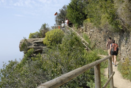 Kurz vor Vernazza fällt das Gelände sehr steil ab, weswegen der Weg mit Geländer gut gesichert ist. |
