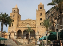 Heute drängen unter dem steil abfallenden Fels die Häuser der Altstadt eng aneinander. Das höchste Bauwerk ist der Duomo der Normannen, er ist zwar neben dem Rocca ein Zwerg, doch als Wahrzeichen überragt er die Altstadt, die zum Glück bis heute unverbaut und von Hochhäusern verschont ist. Der Grundriss von Cefalu stammt noch aus der arabischen Zeit, in der Mitte die Piazza mit dem Duomo der Normannen und rundherum die schmalen Gassen und Häuser gereiht. Sie liefern den wohltuenden Schatten. Das ist wohl der Grund, weshalb Cefalu von allen Orten auf Sizilien noch am ehesten an die arabische Blütezeit erinnert. Obwohl es, ausser dem Waschhaus "Lavatoio medievale" kein arabisches Bauwerk mehr gibt.Cefalu ist gut für jung und alt, und neben Taormina der Lieblingsort der bade-, kultur- und naturhungrigen Touris. Auch leicht zu erreichen mit der Bahn von Messina oder Palermo und von Siziliens Flughäfen meist stündlich mit den großen Buslinien. Die Bucht von Cefalu ist ein großer Sandstrand, für Hotelgäste gibt es die "Spiaggias" mit aufgereihten Liegestühlen und Schirmen, freien Strand, Bars und jeder Menge gebührenpflichtige Parkplätze für 6 €/Tag oder mehr. Was es nicht gibt sind Schattenplätze.
